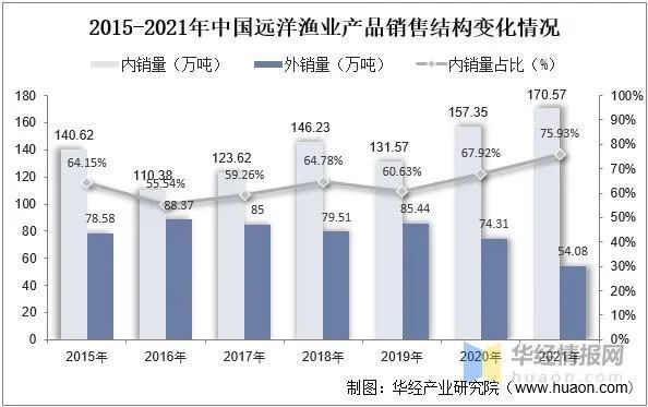 由于远洋捕捞远离近海,运回国内成本较高且部分远洋水产价格较高等原因,我国远洋渔业产品中,大部分高价值水产品会选择直接在国外销售,而低价值品种则运回国内销。随着近年来居民消费能力的提升,使得我国远洋渔业产品内销占比不断提升。据资料显示,2021年我国远洋渔业产品中,内销量为170.57万吨;外销量为54.08万吨。